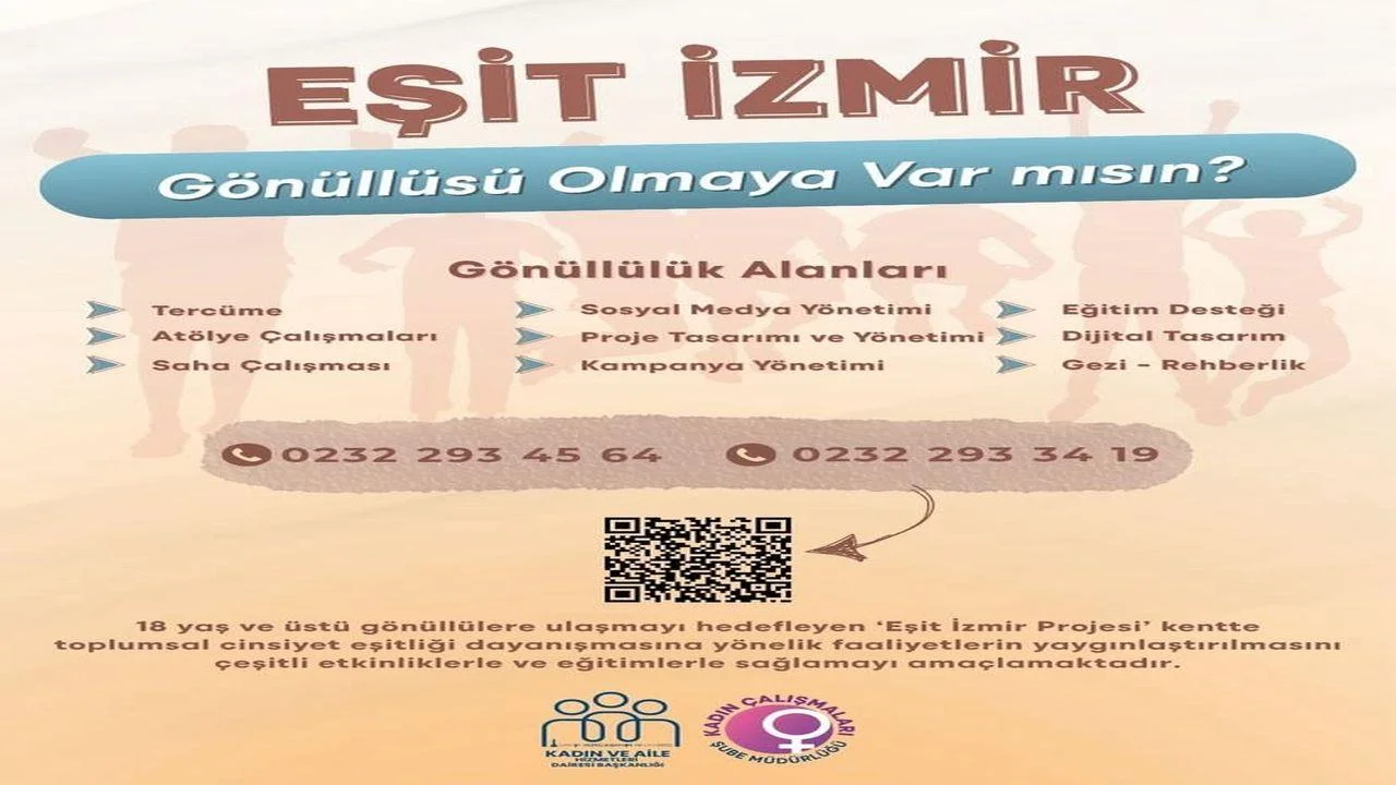 Kadınların ve kız çocuklarının güçlenmesi ve toplumsal cinsiyet eşitliğinin sağlanması için Eşit İzmir projesini başlatan İzmir Büyükşehir Belediyesi, kentte toplumsal cinsiyet eşitliği dayanışmasını pekiştirmeyi amaçlıyor. 18 yaş üzeri gönüllülere ulaşmayı hedefleyen projeye katılmak için https://