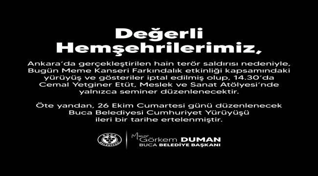 Buca Belediyesi, Ankara’da Türk Havacılık ve Uzay Sanayii A.Ş (TUSAŞ) Tesisi'nde gerçekleşen hain terör saldırısı nedeni ile 26 Ekim tarihine kadar olan tüm etkinliklerini iptal ettiğini duyurdu. Buca Belediyesi’nden yapılan açıklamada şu ifadelere yer verildi:
