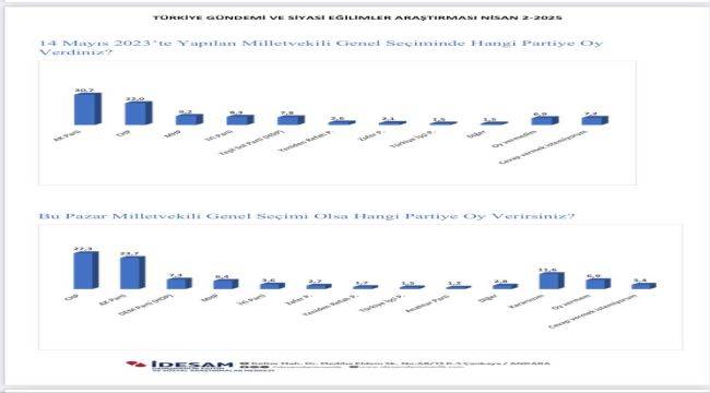 Araştırmanın ''Önümüzdeki pazar genel seçim olsa hangi partiye oy verirsiniz*'' sorusunda ise CHP'nin yükselişinin devam ettiği görüldü. CHP yüzde 35, AK Parti ise yüzde 30 ile ikinci parti olurken, aradaki fark yüzde 5 ile son zamanların en yüksek oranına çıktı.