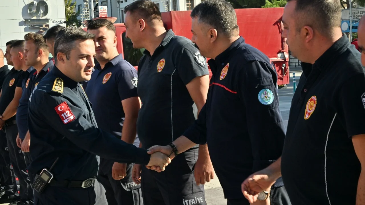 İtfaiye Dairesi Başkanı Gürhan İnal ve itfaiye personeli, Manisa Valisi Vahdettin Özkan’ı
