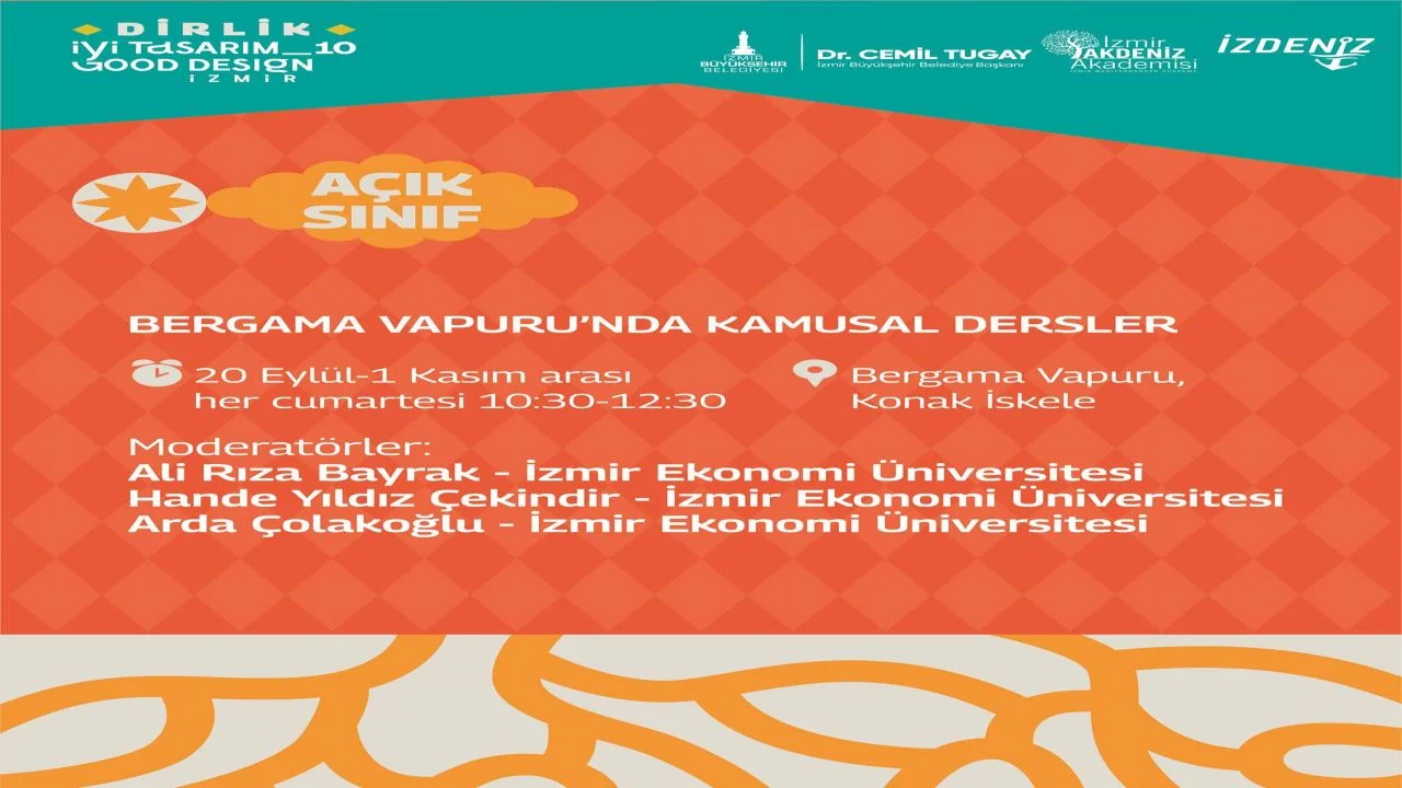 İzmir Akdeniz Akademisi’nin kente armağan ettiği en önemli tasarım buluşmalarından biri olan İyi Tasarım İzmir, bu yıl 10’uncu kez düzenleniyor. “Dirlik” temasıyla yapılacak etkinlik eylül ayı içeresinde ön atölyelerle ve söyleşilerle başlayacak ve 7 Kasım’a kadar kentin farklı noktalarında İzmirlilerle buluşacak. Bu kapsamda düzenlenen “Açık Sınıf: Bergama Vapuru’nda Kamusal Dersler” başlıklı programda ilk ders, 20 Eylül Cumartesi günü, 10.30’da yapılacak. Dokuz Eylül Üniversitesi İzmir Meslek Yüksekokulu’ndan Dr. Öğr. Üyesi Turgay Gülpınar, “Gecekonduyu Özneleşme Üzerinden Düşünmek: Kolektif Yaratıcılıktan Devrimci Potansiyele” başlıklı dersiyle katılımcılarla buluşacak.
