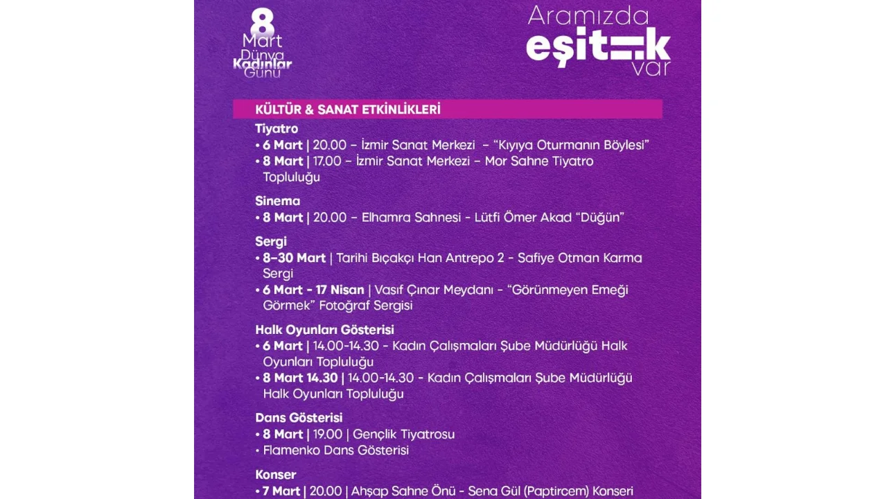 8 Mart programı kültür ve sanat etkinlikleriyle de zenginleşiyor. İzmir Sanat’ta tiyatro gösterimleri, Elhamra Sahnesi’nde Lütfi Ömer Akad’ın “Düğün” filmi gösterimi, Tarihi Bıçakçı Han ve kentin farklı noktalarında sergiler, Gençlik Tiyatrosu’nda dans gösterileri, Ahşap Sahne önünde konser programı ile kadın emeği ve üretimi sanatın farklı disiplinlerinde görünür kılınıyor.