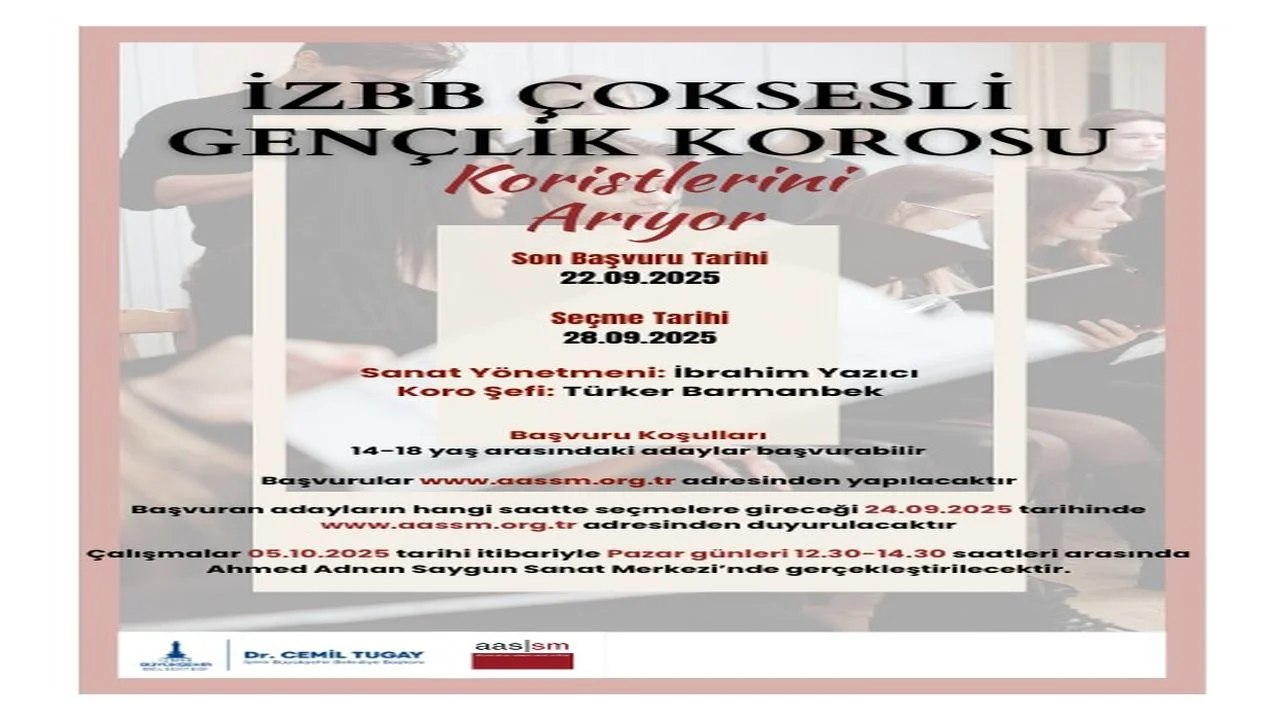 İzmir Büyükşehir Belediyesi Çoksesli Gençlik Korosu’na 14-18 yaş arasındaki adaylar başvurabiliyor. Başvurular https://www.aassm.org.tr/ adresindeki “Başvuru Yap” bölümden yapılıyor. Başvuran adayların hangi saatte seçmelere gireceği 24 Eylül tarihinde www.aassm.org.tr adresinden duyurulacak. Seçmeler, Ahmed Adnan Saygun Sanat Merkezi Küçük Salon’da saat 09.00’da İbrahim Yazıcı’nın sanat yönetmenliği, Türker Barmanbek’in koro şefliğinde yapılacak. Çalışmalar, 5 Ekim tarihi itibariyle pazar günleri 12.30-14.30 saatleri arasında Ahmed Adnan Saygun Sanat Merkezi’nde gerçekleştirilecek.