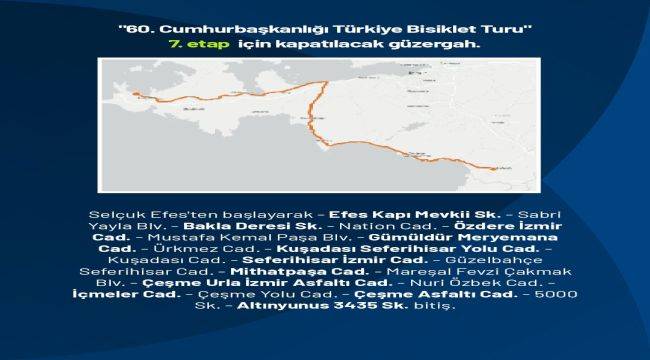 60’ıncı Cumhurbaşkanlığı Türkiye Bisiklet Turu’nun, İzmir sınırlarında düzenlenecek 6’ncı, 7’nci ve 8’inci etapları kapsamında kapanacak güzergâhlar şöyle olacak: