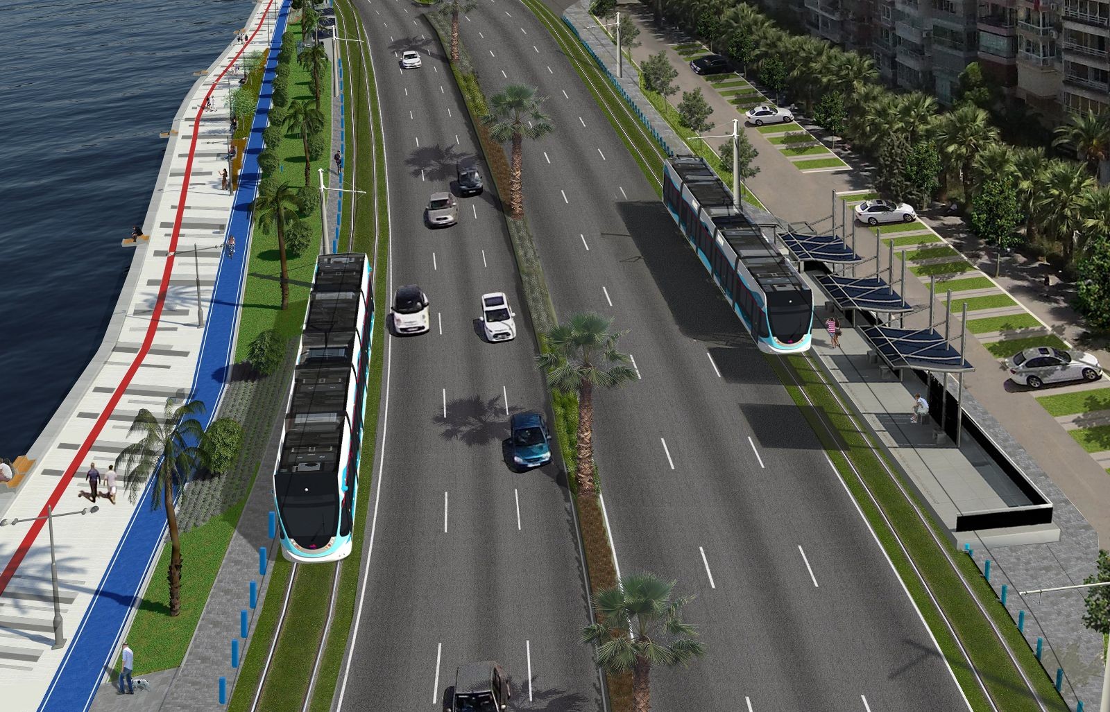 Her iki yöndeki ray döşeme çalışmaları tamamlandığında ise orta refüjde, tıpkı Bornova Ankara Caddesi’ndeki gibi yeni bir peyzaj düzenlemesi gerçekleştirilecek. Yeşil doku ve palmiye ağaçlarının zeminleri deniz suyundan en az etkilenir biçimde tekrar hazırlanacak; sayıları ve nitelikleri geliştirilerek çok daha estetik ve düzenli bir hale getirilecek. Eşit aralıklarla ve aynı boyda dikilecek palmiye ağaçları, güzergah üzerindeki görsel zenginliği artıracak. Orta refüj, renkli çalılar, ağaçlar ve gece ışıklandırmalarıyla yepyeni bir görünüme kavuşturulacak.
