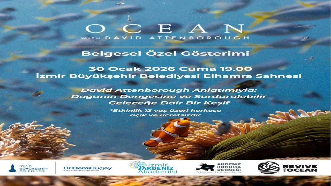 İzmir Büyükşehir Belediyesi İzmir Akdeniz Akademisi, Akdeniz Koruma Derneği iş birliğiyle deniz ekosistemlerinin karşı karşıya olduğu tehditlere dikkat çeken özel bir belgesel gösterimine ev sahipliği yapacak. Dünyaca ünlü belgesel yapımcısı David Attenborough’nun anlatımıyla hazırlanan “Ocean with David Attenborough” adlı belgesel, 30 Ocak 2026 Cuma günü saat 19.00’da İzmir Büyükşehir Belediyesi Elhamra Sahnesi’nde izleyiciyle buluşacak. Okyanusların eşsiz güzelliğini olduğu kadar kırılgan yapısını da etkileyici bir anlatımla ortaya koyan belgesel, iyi yönetilen deniz koruma alanlarının, deniz yaşamını yeniden canlandırmadaki kritik rolünü çarpıcı örneklerle ele alıyor. 2012 yılından bu yana denizlerimizin korunması için çalışan Akdeniz Koruma Derneği’nin, Türkiye’deki çekimlerine destek verdiği “Ocean with David Attenborough” belgeseli, yerel toplulukların katılımıyla yürütülen koruma çalışmalarının, iklim kriziyle mücadele bağlamında neden hayati önem taşıdığını da güçlü biçimde vurguluyor.
