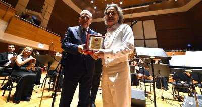 Konseri eşi Türkegül Kocaoğlu ile birlikte izleyen İzmir Büyükşehir Belediye Başkanı Aziz Kocaoğlu, usta sanatçı Timur Selçuk’a “Sanatta 50. Yıl” plaketi vererek kutladı.