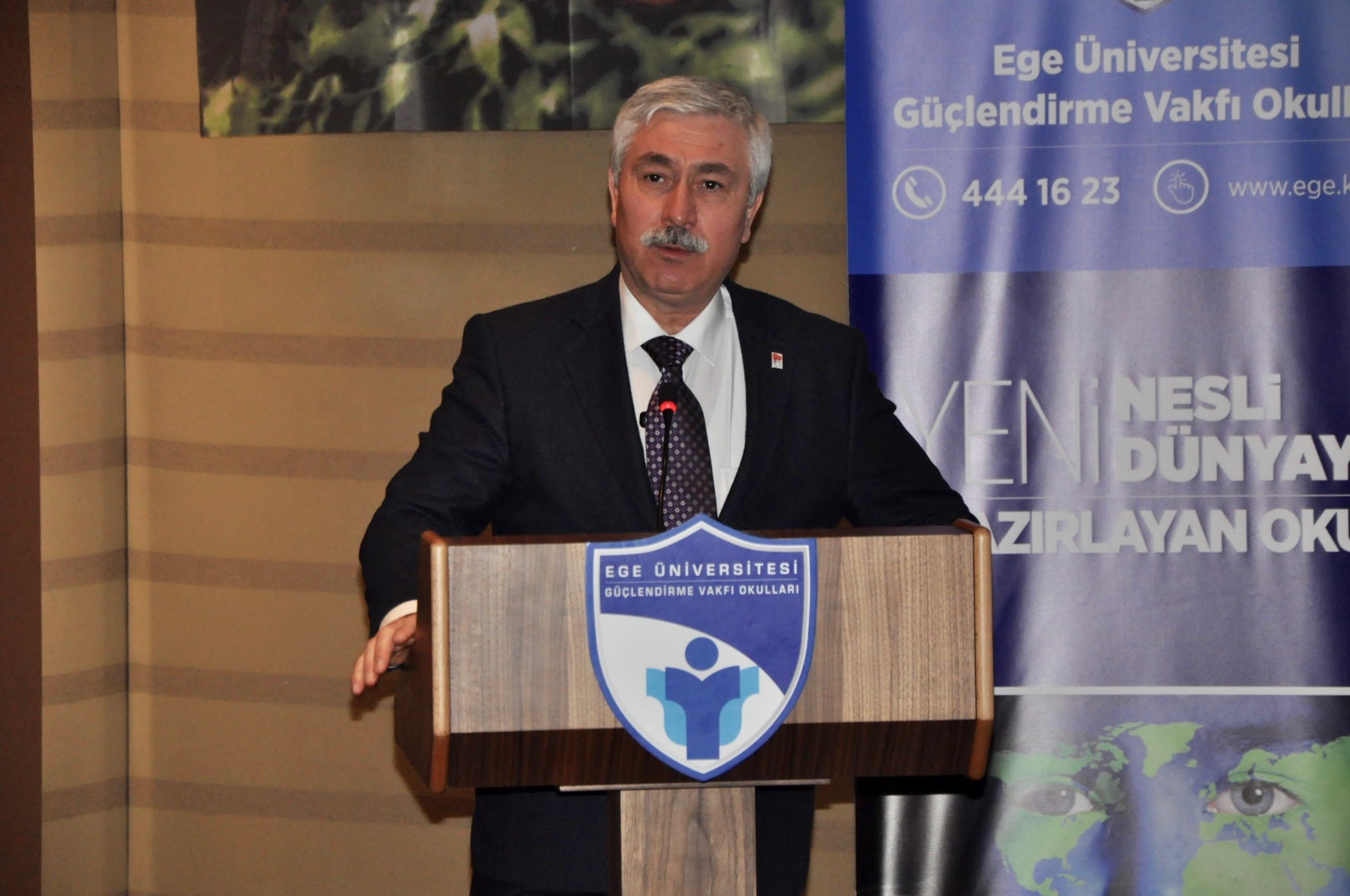 Ege Üniversitesi Rektörü Prof. Dr. Cüneyt Hoşcoşkun, “Ege Üniversitemizin Güçlendirme Vakfı ile ortaklaşa yapılan bu okulların ülkemiz, üniversitemiz ve memleketimiz için hayırlı olmasını diliyorum. Üniversitemizin birikiminin, bu zamana kadarki bilimsel geçmişinin getirmiş olduğu kazanımlarla bu okulların geleceğe yönelik olarak çok iyi şeyler yapacağına inanıyorum. Hedef en az Ege Üniversitesi’nin öğrencileri kadar öğrenci yetiştirmek. Bu demektir ki; yeni dünya, yeni nesil hayata üniversite düşüncesi, zihniyeti içerisinde hazırlanacak. Bu gerçekten büyük bir adımdır ve cesaret işidir. Üniversitemiz bilimsel birikimiyle bu okullara çok büyük katkı sağlayacaktır. Bunun yanı sıra üniversitemizin, çok sayıda öğrenci yetiştirme hedefi olan okullara öğretmen yetiştirme imkanına kavuşacağı için de bizi çok iyi bir geleceğin beklediğine inanıyorum. Günümüzde iş bulma konusunda çok büyük sıkıntılarla karşılaşan üniversite mezunlarımız için bile geleceğe yönelik bir iş imkanı varolması açısında da çok büyük bir kazanım olacağına inancım tam. Geleceğimizin teminatı olan yavrularımızın ne olduğu belli olmayan fetö gibi terör örgütlerinin altında değil de; üniversite anlayışı içerisinde, geleceğe parlak bakan ve geleceğe bilimsel açıdan yön veren üniversite vakfının ve üniversite hocalarının kontrolünde, denetiminde ve de aynı zamanda üniversitemizin bilimsel desteğiyle yetişmesi geleceğimiz için çok kazançlı ve parlak olacaktır. Ben bu okullarımızın İzmirimiz, ülkemiz ve de dünya için ülkemizin bir marka olması açısından çok gerekli olduğuna ve hedefin de bu olması gerektiğine inanıyorum. Kendilerini kutluyorum. İnşallah çok kısa zaman içerisinde bu okullarımızın başarılarını, burada yetişmiş olan, geleceğimiz olan yavrularımızın mezun olduklarını görür ve onları kutlarız” dedi